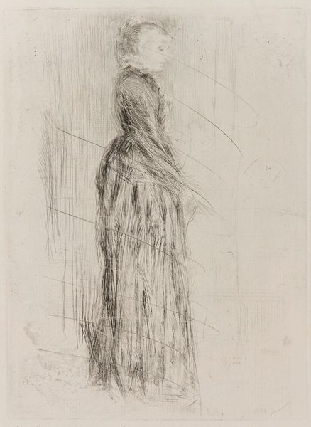 Editor: So, here we have Whistler's unfinished sketch of Lady Haden. It's all lines and delicate shading. What do you see in this piece, considering its incomplete state? Curator: The beauty of this work resides precisely in its state of incompletion. Notice how the lack of defined form directs our attention to the linear structure itself. The hatching and cross-hatching create tonal variations, yes, but more importantly, they reveal the artist’s process. Editor: So, the process becomes the focal point, not necessarily the finished image? Curator: Precisely. We are invited to consider the materiality of the artwork, the intentionality of each mark, and the inherent qualities of the medium. Editor: That’s a very different way to look at an unfinished work; I'm glad I asked! Curator: Indeed, looking beyond the 'subject' is key to understanding such works.