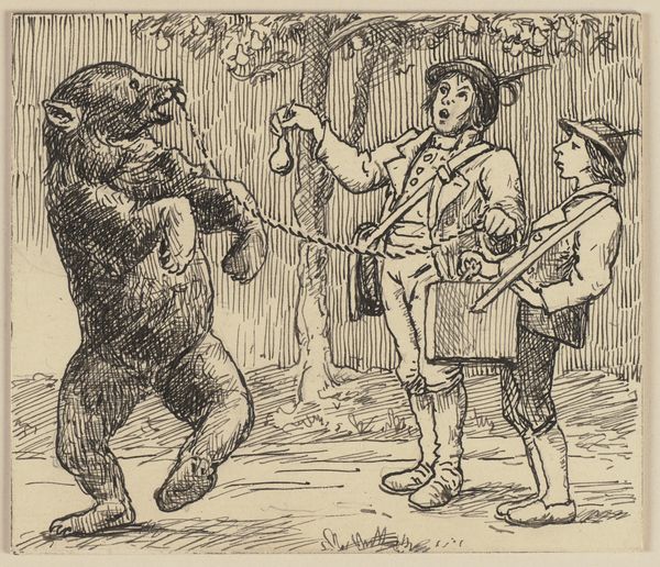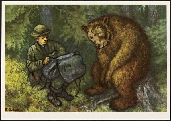 Curator: This is Mort Künstler's "Night of the Grizzlies" from 1970, painted in oil. I'm immediately struck by the narrative it presents. It seems very dramatic, perhaps even melodramatic, in its depiction of man versus nature. What do you make of it? Editor: It does feel very staged, almost like a movie poster. There's a lone man defending himself against two massive bears! How should we interpret the broader story that Künstler is telling here? Curator: Consider the context. The 1970s saw a rising awareness of environmental issues, coupled with anxieties about the disappearing wilderness. Think about how this imagery might resonate with broader discussions of power. Who is typically seen as the intruder? And who has the power? Is it really as simple as man versus beast? What’s your initial reaction? Editor: I initially see the man as brave, perhaps a victim. But, I get your point. There's something about the composition—the way the bears dwarf the man, and the unnatural stance they are taking, that maybe suggests the violation of the bear’s natural habitat… Curator: Exactly! The aggressive pose of the bears could symbolize the disrupted ecosystem retaliating. Note the relatively small size of the deck on which the man stands. Where exactly is this story situated, both physically and historically? Think about land ownership, about whose story typically gets told. Editor: So it becomes less a heroic tale and more a commentary on encroachment? And also, I’m not familiar with the original story. Curator: Precisely. Kunstler presents us not with a straightforward action scene, but with an allegory of the consequences when we disregard the delicate balance of nature. Are we meant to empathize with the man simply because he’s human? Editor: That's a totally different way to consider the artwork. It highlights how deeply ingrained anthropocentrism is, doesn’t it? Thanks so much! Curator: A fruitful reflection indeed, one that goes to the heart of the image and encourages questions about much more than the image.