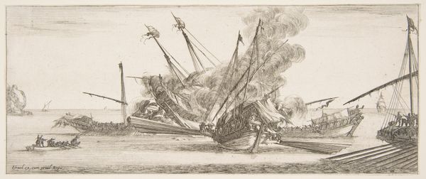 Editor: This is "Transport by Sea: Maintaining Food Supplies" by Charles Pears. The scene is bustling with ships, giving a real sense of industry and labor. What can you tell me about the materials and context here? Curator: This piece shows us the very sinews of empire and industry. Consider the charcoal or graphite: readily available materials used to depict the complex machinery of food distribution. How does the artist’s choice reflect the everyday reality of maintaining a system of consumption? Editor: That’s fascinating. The drawing style feels so immediate, almost like a news report. Curator: Exactly. Pears isn't just showing ships; he's illustrating the process, the labor, the act of maintaining a food supply. It makes you consider the vast network behind every meal, doesn't it? Editor: Absolutely. I’ll never look at a simple drawing the same way. Curator: Nor will I. It makes you consider the means and the making, doesn't it?