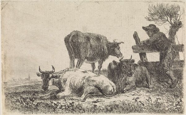 This etching at the Rijksmuseum, "Twee koeien van achteren gezien", presents us with a seemingly simple scene: two cows in a pasture. Yet, within this image lies a wealth of cultural memory. The cow itself, throughout history, has served as a potent symbol of nourishment, fertility, and prosperity. Think of ancient Egypt, where the cow goddess Hathor was revered, or the sacred cows of India, embodying life-giving abundance. Here, the anonymous artist presents the cows from behind, inviting the viewer to contemplate the animal's bulk, its presence in the landscape. It's as if we are drawn into the scene, becoming part of the rural setting. This compositional choice is not unique; we find echoes of it in pastoral scenes across various periods, each subtly imbuing the animal with layers of meaning, from simple agrarian life to deeper notions of nature's bounty and our connection to it. The image taps into our collective unconscious, reminding us of simpler times and the fundamental relationship between humans and nature. It’s a scene that resonates with a sense of timelessness, a reminder of the enduring power of archetypal images.