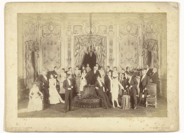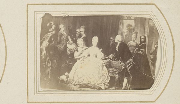 Curator: Here we have an intriguing photo reproduction of a print. The print itself is an etching after a painting by H. Merle entitled "Beethoven chez Mozart," credited to Paul Allais. Its creation date hovers somewhere between 1855 and 1885. Editor: It feels almost theatrical, doesn’t it? All those frilly gowns, Mozart caught mid-aria…like a tableau vivant caught in sepia tones. It's staged history, wouldn't you say? Curator: Indeed. The composition certainly leans into dramatic flair. Notice how the figures are arranged, with Beethoven relegated to the side, at the keyboard, while Mozart commands the center. The dynamism stems from that division—a contrast of contemplative genius versus performative brilliance. Editor: And that dog! Did you see the tiny dog darting about? It's wonderfully irreverent amidst all that powdered wig seriousness. Gives a much-needed jolt of life, doesn't it? Plus it tells me, hey, this moment probably never really happened but is more likely a charming fantasy instead. Curator: The artist manipulates light and shadow to further highlight the contrasts within the scene. Observe the way light falls upon Mozart, drawing the viewer's eye, and the darker tones used to depict Beethoven's more introspective position. It is carefully considered; however, in terms of its success I have reservations. Editor: Oh, I find it rather winsome. A bit sentimental perhaps, but there’s a naïve charm that I can’t help but appreciate. It captures an idealized version of musical history, a wishful collaboration between titans, regardless of its realism or success in actually portraying their characters, you know? Curator: I concede the potential for sentimental interpretation, particularly when contextualized within 19th-century Romanticism, to which it surely belongs. And that’s where, despite reservations about its execution, its appeal lies. Editor: So, a sepia-toned daydream of musical giants. It tickles the imagination even if the scene it depicts exists only in the realm of artistic fancy. Curator: Precisely. It's an exercise in idealization rather than historical documentation, mediated through various layers of artistic interpretation. An object lesson in seeing rather than just looking.