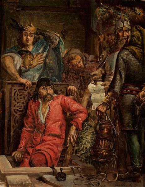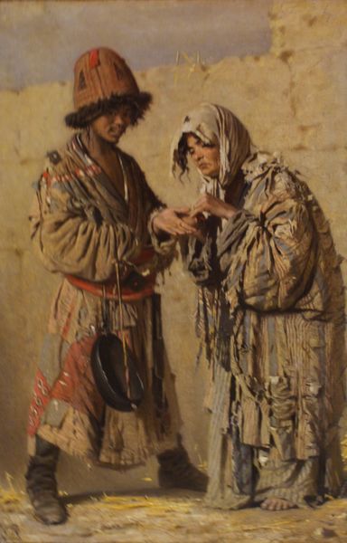 Vasily Vereshchagin captured this scene of Politicians in an opium shop in Tashkent using oil on canvas. The artist’s choice of material creates a sense of realism, drawing us into the dimly lit space. Vereshchagin masterfully uses the qualities of oil paint to depict the textures of the clothing and the expressions on the faces of the men. Note the garments, seemingly fashioned from richly patterned textiles, yet tattered and worn, reflecting the social realities of the setting, which the artist encountered while serving in the military. The weight of history and the weight of circumstance are palpable. Through his careful application of paint, Vereshchagin doesn't just present a scene, but prompts us to consider the conditions of labor, the politics of the time, and the human cost of consumption. This painting challenges the traditional boundaries of fine art, inviting us to reflect on the social context embedded in the artwork itself.