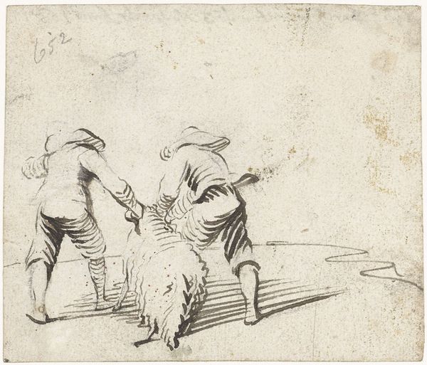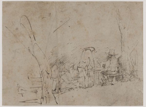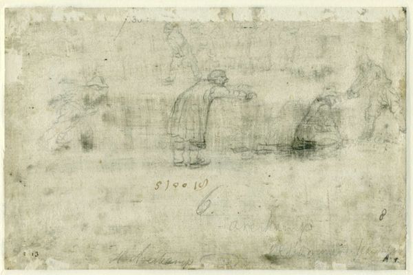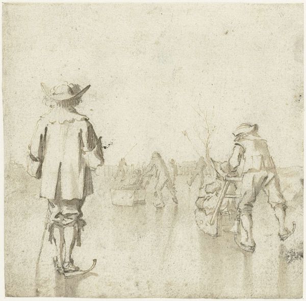 Harmen ter Borch sketched "Man en vrouw pratend bij een hek" using pen in grey ink, probably in the 1660s. Ter Borch lived during the Dutch Golden Age, a period marked by unprecedented economic prosperity. This tiny sketch is replete with the visual markers of gender and class. We see a man, perhaps a traveling merchant, with a walking stick, while the woman stands by a fence with a basket. Are they equals? What is the nature of their encounter? The Dutch Golden Age was also an age of strict social hierarchies. Costume served as an immediate signifier of one’s place in the world. What narratives might be buried in the simplicity of this sketch, a medium that itself was undergoing something of a boom in the 17th century? What anxieties did these people hold as the tides of commerce lapped at the shores of identity?