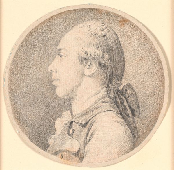 This is a portrait of Christian VII by C.F. Schrader, its exact date is unknown. The miniature’s formal structure is immediately striking. Encased in an oval frame, the king's profile is rendered with a stark linearity that emphasizes his regal bearing. The monochromatic palette focuses our attention on form and texture; from the delicate wisps of his powdered wig to the smooth contour of his face. The strategic use of light and shadow models the contours of Christian's face. Note the way the artist uses contrast to highlight the king’s aquiline nose, underscoring his aristocratic lineage. Schrader's emphasis on line and form underscores the subject's status and power through controlled design. Consider how this portrait manipulates visual cues to create an idealized image. It presents a figure whose identity is as much constructed by the formal elements of the portrait as it is reflective of reality.