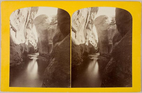 Editor: This stereograph, entitled "Kiss me Quick" and "Kiss me Softly", by H.D. Udall, dating from 1875 to 1899, seems to show a narrow passage between rocks, or perhaps a rock formation that resembles two large boulders almost touching. It’s interesting to see landscape depicted this way. What do you see in this piece? Curator: The success of this photograph lies primarily in its formal composition. Consider the dramatic chiaroscuro, the stark contrast between light and shadow. It emphasizes the geological textures. What compositional elements do you find most striking? Editor: Well, the way the photographer framed the shot to create almost symmetrical halves that meet in a slim central gap – is that gap creating tension through contrast? Curator: Precisely! The tension arises from that very point, dividing the stereograph into contrasting sections that repeat each other but don't quite converge. And observe how the artist has printed their business information; “Imperial Gems” implying some commentary on these rocky forms. Editor: I see what you mean about the compositional balance now, and also how the materiality of the rocks works with that contrast, rather than against it. So, while there is no kissing at all, perhaps nature itself, even the non-living aspects, has tenderness. Curator: An astute reading. The beauty of formal analysis allows us to discover such nuance.