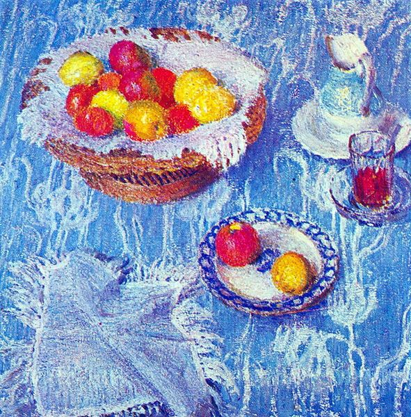 Curator: This painting, "The White Tureen," was completed in 1969 by Frank Mason, employing oil paint in the still-life tradition. Editor: The first thing that strikes me is how heavy and cold it feels, despite the warmth implied by the fruit. It is an interesting paradox between surface appeal and underlying emotional tone. Curator: Yes, and to really unpack the “coldness,” let’s consider Mason's socio-political position as a realist painter in a milieu dominated by abstraction and conceptual art; he's consciously positioning himself against the mainstream, perhaps a silent act of defiance. It also may connect to themes of American affluence amid the burgeoning social movements of the late '60s. Is it highlighting a sense of excess and indulgence during that transformative era? Editor: I'm drawn to the tureen itself; think about the craftsmanship and materials that went into it. Silver wasn’t merely valuable; it signaled a degree of leisure, a class distinction reliant on mining, trade, labor. In its own way, the painting prompts the consideration of historical relations of production made manifest in the finished product. How interesting to use such an antique artifact during the height of plastic consumption! Curator: Absolutely, the juxtaposition with the fruit evokes a powerful contrast too, suggesting themes of ephemerality, decay and consumerism when situated with that long standing tureen; what is preserved and what decays speaks to class structures that elevate one over the other. Consider also the whiteness, what we understand today as part of institutional culture, also found its origin perhaps here, in table settings. Editor: Looking at the drapery too, those deep folds! This emphasizes the interplay of light and shadow that showcases not just the linen's texture but also points us to the art of laundering—women's labor, of course, traditionally—as integral to the display of bourgeois respectability. Curator: This piece asks how those labors serve an art world that, even now, fails to value them adequately. It's not simply a still life; it's a socio-historical inquiry painted with stunning, if somewhat biting, precision. Editor: I'll leave with a material assessment: from that viewpoint, Mason asks the question; “what is rendered valuable enough to depict?” It gives so much weight to surfaces, to a silver patina that occludes and obscures the fruits of somebody’s invisible labor.