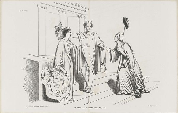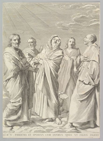Curator: Here we have "Beeld van een man in toga," or "Figure of a Man in a Toga," an engraving created in 1608 by Cornelis Galle I, part of the Rijksmuseum's collection. Editor: It has an air of neoclassical gravitas, but the line work is very sharp, controlled, and a bit rigid; the drape of those togas looks incredibly weighty, almost metallic. Curator: Yes, Galle was quite adept at capturing textures through the etching and engraving process. But think about what the toga represented: status, citizenship, power. This image likely reflects Galle's academic approach in visualizing power, perhaps commissioned to promote certain social values of the time. We also see different stages in their lives, their youth is a part of who they become in society. Editor: Exactly, these are commodities aren't they? Power objects translated and accessible through a readily reproducible medium like the engraving. What about the material quality of that paper it’s printed on though? We never think about it - where it comes from, who labored to produce it, and for whom was it available. This could inform ideas on the economics of portraiture at this time, if not of that material and what access society had at the time to paper as such. Curator: An interesting point. I also consider the perspective: it appears from a distant objective, which further reinforces social barriers, the inaccessibility of such figures... Or, are we, the audience, made complicit to idealizing specific versions of masculinity by Galle through the manipulation of this artistic lens? Editor: Possibly - still that begs a question. How did these printed images circulate, and what meanings might they have acquired within different socio-economic groups? The lines in these works had to be etched by somebody, and by whose standards and requirements are those marks being translated into images to be printed? Curator: Considering its original context and possible intention helps us examine not only how historical images of powerful men shaped their identities then, but also how we continue to engage with gender, power, and representation now. Editor: Agreed. Examining this work with an eye toward materiality and social circulation makes us better understand the power of images within systems of value.