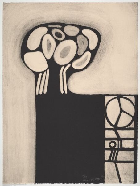Editor: We're looking at Emerson Woelffer's "Untitled" from 1961, a print in monochrome. It feels almost like a stylized face or figure, stark and bold. What strikes you when you look at it? Curator: I'm drawn to the raw simplicity and its resonance within the socio-political context of its time. Consider the early 60s – a period of significant social upheaval and questioning of established norms. Does this abstraction serve as a subtle commentary on societal fragmentation or the deconstruction of identity in a rapidly changing world? Editor: That's a really interesting angle. I was just seeing shapes. Curator: The "shapes," as you call them, speak volumes. The hard edges and almost confrontational composition feel deliberate. Are we looking at a commentary on surveillance, with the abstracted “eyes”? How might we interpret its lack of a definitive title – a deliberate choice perhaps to encourage multiple readings and dialogues? Editor: Surveillance? That's not something I would have considered initially. The two larger circular shapes, like you said, could be read as “eyes.” Curator: Think about how the visual language of abstraction provided artists with a powerful tool to engage with complex social issues while circumventing direct censorship. Does the print’s monochrome palette suggest a world stripped of color, perhaps reflecting the limitations imposed on individual expression during this period? How does it sit in contrast with the Pop Art movement also happening? Editor: So, looking beyond the immediate image allows a far deeper understanding. I see this work in a new light now, beyond its abstract qualities. Thank you! Curator: Exactly! This dialogue between form and context allows us to unpack the layered meanings embedded within the artwork, enriching our appreciation and understanding of Woelffer's vision and intent.