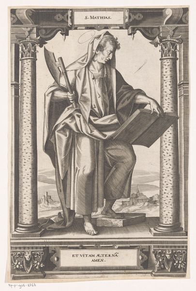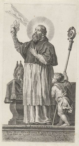 Editor: This engraving, “Heilige Patricius” by Mattheus Borrekens, created in 1644, depicts Saint Patrick. I'm struck by the almost unsettling juxtaposition of the holy figure with the grotesque dragon at his feet. What can you tell me about its symbolism and context? Curator: This piece speaks volumes about the construction of power and the suppression of indigenous beliefs during the spread of Christianity. Saint Patrick is presented as triumphant, standing over the defeated dragon – a clear allegory for the vanquishing of paganism in Ireland. Notice the cherub actively piercing the snake; it’s not merely decorative, but a symbol of actively suppressing existing beliefs. How might this image have served the political and religious agenda of the time? Editor: I suppose it was intended to reinforce the Church’s dominance and legitimize its power by visually representing the triumph over pre-Christian traditions. Is the specific style of the engraving itself a reflection of the socio-political environment? Curator: Absolutely. The Baroque style, with its dramatic contrasts and emotional intensity, served to amplify the message. Consider the way the light falls, highlighting Saint Patrick and obscuring the dragon. This theatricality was used to persuade and inspire devotion, but also to assert control. What does it suggest to you about the visual language used to justify colonialism and cultural erasure? Editor: It highlights how art can be used not just to depict, but to actively shape perceptions and beliefs, and enforce societal norms by demonizing existing cultural practices. Thank you, it definitely made me think more critically about the visual narratives in the piece. Curator: And to think about whose stories get told, and whose are erased, is a crucial step in understanding not just art, but also history and its impact on our present.