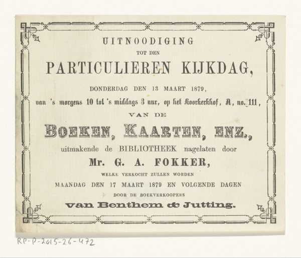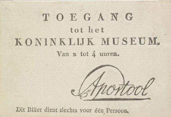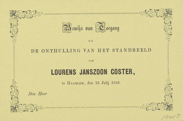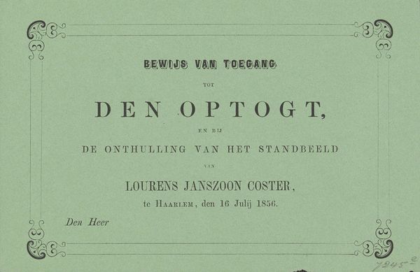 This is an admission ticket to the fireworks display for the unveiling of the statue of Laurens Janszoon Coster in Haarlem on July 17, 1856. The anonymous artist has designed a formal structure that frames the event in a very specific way. The composition is dominated by text, arranged hierarchically to guide the eye. Ornate, symmetrical flourishes at the corners soften the rigidity, adding a touch of elegance and historical context. The muted color scheme, likely due to the printing limitations of the time, evokes a sense of historical distance, inviting viewers to consider the piece as a relic of a bygone era. Viewing this piece through a semiotic lens, we can see how the typography and decorative elements serve as signs. They collectively construct a message about civic pride and historical commemoration. The ticket functions not just as an invitation but as a symbol of status, granting access to an exclusive cultural event. It acknowledges the enduring relevance of Laurens Janszoon Coster as a cultural icon, a narrative that is perpetually reinterpreted through art.