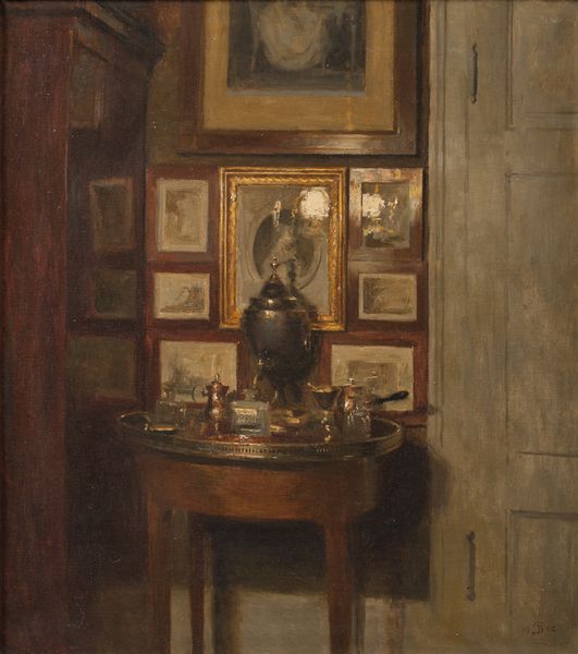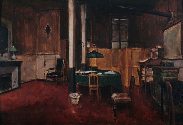 Curator: Here we have "View of the artist's studio" by Alfred Dehodencq. He renders the intimacy of his creative space with visible brushstrokes of oil paint. Editor: Ah, a place of beautiful creative chaos! It has that comfortable, slightly rumpled feel – like settling into a favorite armchair after a long day, or maybe just finishing that last stroke on a painting. Curator: It's interesting to consider this scene not just as a snapshot, but as a constructed narrative about artistic identity. The objects within the studio – the canvases, the ladder propped against the bookshelves – each tell a story about labor, inspiration, and perhaps even the socioeconomic conditions of artistic production. Editor: True. Though I'm less drawn to analyzing and more drawn to experiencing the mood. It has an honest feel. It also feels dimly lit, like being in a cozy, secret den! Do you feel that, or am I totally projecting? Curator: Not projecting at all. I think the painterly technique contributes to that intimacy; the impasto highlights suggest a play of light, possibly candlelight, capturing the solitary dedication to their work. Genre painting gives glimpses into everyday lives; it reveals a perspective on the self as well as their status. Editor: It’s definitely about revealing that sense of self. Maybe this piece suggests that an artist's studio reflects as much inward as it looks outward. You know? Art inspires art! Curator: Yes, precisely! This "view" suggests that the studio is an ecosystem of creative energy. By placing this view on display, Dehodencq brings us intimately into the inner and physical space of the artist. Editor: It’s left me feeling rather creatively restless now, time for a dash!