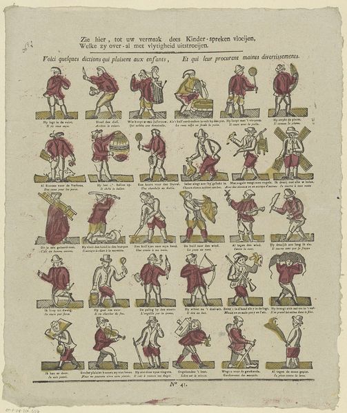 Editor: Here we have "Militairen," or "Military Men," a print by Philippus Jacobus Brepols, created sometime between 1800 and 1833. It shows rows of toy-like soldiers, very neatly organized by nationality. What strikes me most is how flat and almost manufactured they appear. How would you interpret this work? Curator: From a materialist perspective, I’m drawn to the means of production here. This isn’t just a drawing; it's an engraving, likely intended for mass consumption. Consider the social context: early 19th century, a time of shifting national identities and ongoing conflicts. How does the print, with its seemingly innocent depiction of soldiers, function within that environment? Is it propaganda, a children’s toy, or something more complex? Editor: It's interesting that you focus on its potential as a commodity. The soldiers are so stylized, almost like paper dolls. Were they perhaps meant to be cut out and played with? Curator: Exactly! And that brings up questions of labor and consumption. Who was producing these prints? What was the social status of the people purchasing and using them? The relatively simple engraving suggests a certain level of accessibility, yet the uniforms reflect a clear hierarchy and military structure. This tension between the accessibility of the print and the elitism of the military is crucial. How does that inform your reading? Editor: It makes me think about how even seemingly simple images can reflect broader power dynamics within society. I had only considered it for its aesthetic. Curator: And by understanding the processes and materials involved in its creation, along with the context of its distribution and intended use, we start to understand that art's true power resides not just in representation, but also in how it is produced, circulated, and consumed. Editor: Thank you for the insight!
