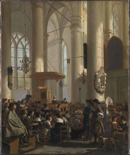 Johannes Bosboom painted "A Service in the Geertekerk, Utrecht" with oil on canvas, a material that was by his time a mainstay of fine art. Bosboom was known for his church interiors, and he often worked in a muted palette, as we see here. But the real material interest is less in the paint itself, and more in what it represents. The Geertekerk, like many churches in the Netherlands, has an aesthetic of Protestant austerity. The artist has carefully depicted the bare walls, the plain wooden pews. This is not to say that the building is without ornament: note the chandeliers, rendered with painstaking detail. Still, the emphasis is on functionality and the absence of ostentation. Bosboom shows us a place of worship stripped down to its essence. This aesthetic choice reflects a specific social context: the rise of a mercantile culture in the Netherlands, and the associated values of thrift, diligence, and piety. This painting isn't just a picture of a church; it's a portrait of a culture.