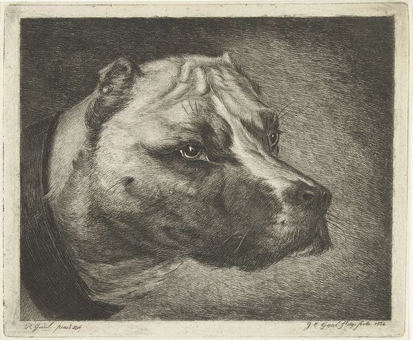 Jacobus Cornelis Gaal created this etching of a pug in 1858. An etching is a printmaking technique that uses acid to cut into a metal plate, in this case likely copper, to create a design. The plate is then inked, and the ink is transferred to paper, creating the print you see here. Look closely, and you can see how Gaal used different densities of lines to build up the image, creating areas of light and shadow that define the pug's features. The hatching creates a sense of texture, from the dog’s short fur to the soft shading around its face. What’s interesting here is how a relatively simple technique could achieve such a detailed result. This speaks to the artist's skill and labor in manipulating the etching process. Printmaking, like etching, has always been tied to wider social issues of labor and consumption, especially in the 19th century when printed images became more widely available. Appreciating the time and skill involved challenges the traditional hierarchy between fine art and craft.