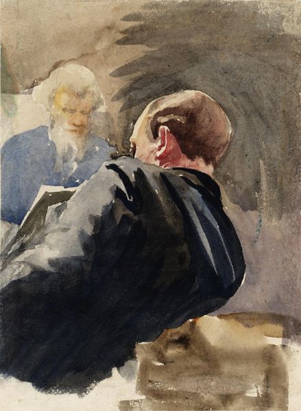 Editor: This watercolor, "Lezende dame en bordurend meisje, van voren gezien, in het huis aan de Riouwstraat 6, te Den Haag", made sometime between 1872 and 1950 by Barbara Elisabeth van Houten, has a strangely calming effect on me. I mean, nothing much is happening. It's not grand, but almost painfully quiet, like a memory fading at the edges. What captures your attention when you look at this piece? Curator: The very act of noticing that quietude, that’s where the magic begins, doesn’t it? It pulls you in. The hazy washes, they almost whisper, demanding you lean closer to hear the untold stories. For me, it's this incredibly tender portrayal of domesticity. Look at the light, almost caressing their faces as they lose themselves in their individual crafts. I wonder what their relationship is, don't you? Are they sisters, mother and daughter? Editor: I do, now that you mention it! Is it my imagination, or are their dresses significant? The reader is wearing what looks to be a very sober black or dark blue, while the sewing woman wears white with shades of beige, which I believe means a symbol of purity or peace? Curator: It absolutely *could* be read that way, the dark and light clothing, as opposing states. Or, perhaps, it could speak of practicality! The light, reflecting off of the needlework onto her face while she meticulously performs her art; or, vice versa, of one resigned to be more serious-minded due to circumstances. One way to consider symbolism and intimacy that's always resonant with me is how one defines ‘home’, in whatever circumstances one dwells within. This intimacy echoes the Dutch Masters but with a more vulnerable touch, don't you agree? Editor: I definitely see the Dutch Master connection now. It makes me rethink what “important” art is… it doesn't have to be a grand battle scene to evoke something profound, it seems. Curator: Exactly! Sometimes, it's in the everyday, the quiet moments, that we find the greatest resonance, *n'est-ce pas*?