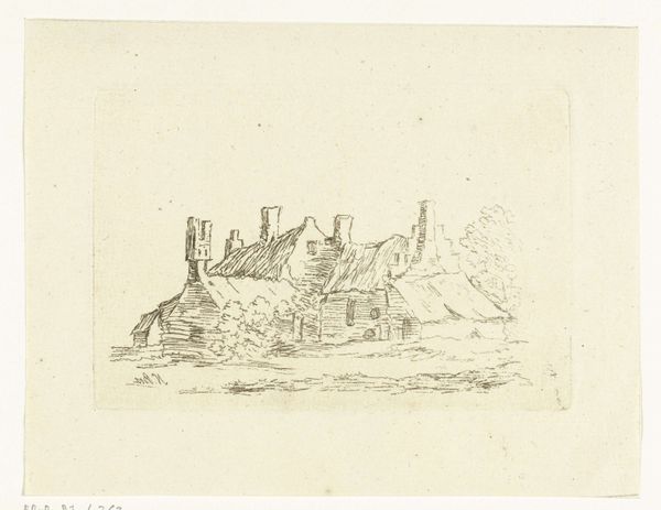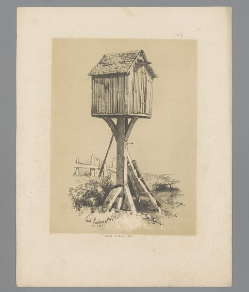 Curator: We’re looking at "Boomstronk met duivenhok," or "Tree Trunk with Dovecote," an ink and pencil drawing on paper, created around 1812 by Jacobus Adrianus Weiland. Editor: Immediately striking is its perched composition. The dove house almost floats ethereally above the landscape, an architectural fantasy balanced precariously on the aged tree trunk. Curator: It’s interesting how Weiland elevates this structure, both literally and symbolically. Dovecotes in Dutch culture historically signified status and peace. By placing it high above the viewer, he’s perhaps emphasizing these qualities. Note the detail around the dove house doors. Editor: The texture of the wood—the horizontal stacking—draws the eye. It’s balanced against the scratchier rendering of the tree itself and ground vegetation. The contrast between the rigid structure and the more organic lines contributes a lively tension to what could otherwise be a rather staid pastoral scene. And what's the meaning behind those boards below the tree trunk, just placed seemingly at random on the ground? Curator: Perhaps the ladders give the pigeons a takeoff point or maybe serve as structural supports in need of mending, which reveals an interaction between human and nature that might signify both dependence and harmony in Weiland's time. Remember, it was created just after the Napoleonic wars, when a yearning for tranquility emerged. Editor: Yes, a return to simpler things. But it’s more than simple. I notice Weiland uses multiple styles, blending rough strokes to build texture with precise linear outlines that suggest dimension. The way it is so delicately rendered brings the focus to this quiet countryside. Curator: Perhaps a reflection on the architectural ideas themselves. Or, maybe he's telling us more about the past, because these dove cotes, once symbols of privilege and markers of prosperity, are increasingly relics. What do we remember of them? What memories do they signify? Editor: Interesting thought. Ultimately, for me, this work achieves a compelling unity, using line and form to create a scene where stability and fragility intertwine. Curator: For me it's more than an aesthetic object, it embodies themes that are so timeless and remind me that sometimes in nature, the ordinary can also point toward larger truths.