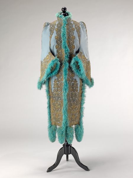 This accessory set was made by C. G. Gunther's Sons, although the precise date is unknown. The set, comprised of a cape, bag, and scarf, immediately strikes one with its stark contrasts. The cream-colored fur juxtaposes dramatically with dark brown detailing, creating a compelling visual rhythm. This chromatic interplay isn't merely decorative; it structures the entire composition, defining forms and delineating boundaries. The regularity of the applied tips is a semiotic system, hinting at both luxury and the objectification of nature, perhaps reflecting the societal values of the time. One might consider how this arrangement functions within the broader context of fashion as a signifier of status and wealth. The meticulous arrangement challenges any sense of naturalness. The set invites us to reflect on the artificiality inherent in displays of wealth, and the complex relationship between nature, culture, and commerce. This is not just about adornment; it is an expression of cultural values, inviting continuous questioning and interpretation.