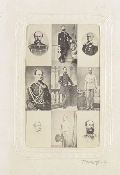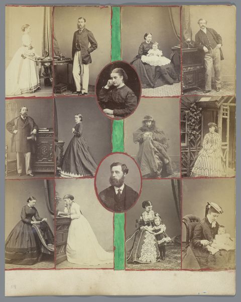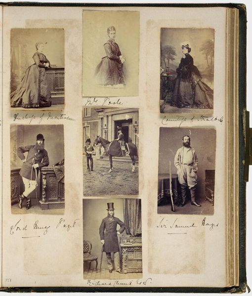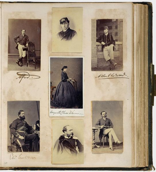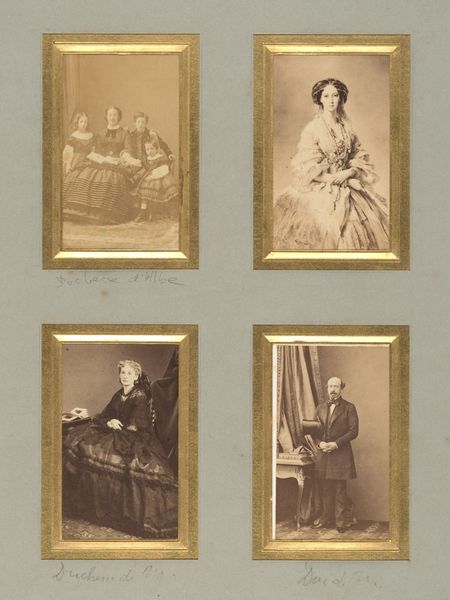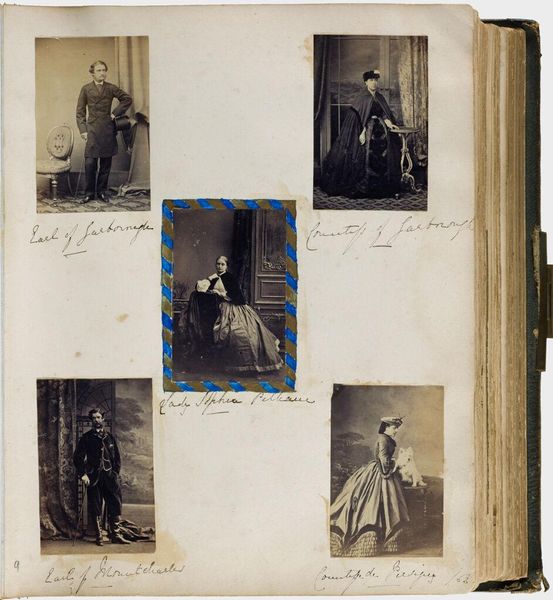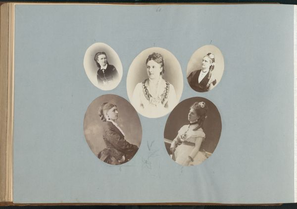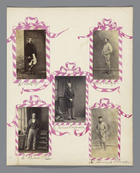 Curator: Here we have a page from a photo album, likely dating from the late 1860s. It combines five carte-de-visite portraits with hand-drawn embellishments in ink. Editor: What strikes me immediately is the formality contrasted with that rather whimsical hand-drawn ornamentation. It's a strange pairing—rigid portraiture softened by almost childlike drawings of bows and ribbons. Curator: Exactly! The cartes-de-visite themselves were mass-produced, enabled by advances in photographic techniques. These albumen prints would have been relatively affordable and widespread. But look closer. Editor: Yes, the addition of the inky green designs makes it unique, doesn't it? A personal touch elevating what was essentially a commodity into something more individualized. Curator: Consider the social implications. Photography democratized portraiture, making it accessible beyond the wealthy elite. This album page reveals how individuals actively shaped and personalized these standardized images to express their social status and relations, but the materiality adds the intimate part as it has been designed by the lady herself for her beloved ones. Editor: Looking at the composition, it feels like an attempt to inject some visual rhythm. The portraits are carefully arranged, creating a satisfying symmetry. The green ribbons frame them but also lead the eye from one face to the next. The bows create almost like little gift wrap design, Curator: True. Each frame also reflects an individual sitting for a photograph: their stance, clothing and personal artifacts are carefully curated. Lady Filmer knew how to construct family in photographs to leave for the generations to come! Editor: In short, it's not just about who's depicted; it's about how they're depicted and in turn about who and how was arranging them. Curator: And how even mass-produced objects could be reworked. So, this seemingly simple album page actually presents a window into 19th-century social practices and photographic technology. It tells stories that stretch far beyond each person portrayed. Editor: Indeed, a potent mixture of constraint and craft that resonates far beyond its humble, domestic scale. This is so simple and powerful!