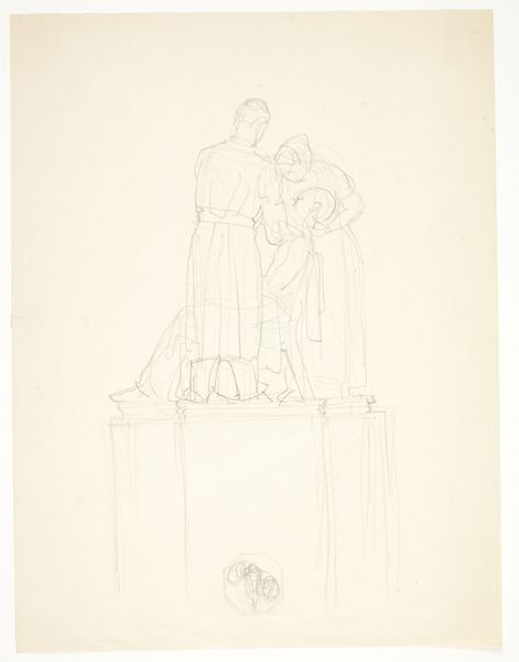 Editor: This drawing, "Grave Monument with Cross, No. 731," likely created between 1840 and 1880, is a simple graphite and pencil sketch on paper. It feels so understated, almost like a preliminary design. What catches your eye in this piece? Curator: Primarily, the meticulous articulation of form commands my attention. Observe how the artist meticulously delineates the cross's structure, its constituent geometric shapes meticulously rendered with precision. The interplay of lines and planes constructs a tangible object within the picture plane. Editor: Yes, it's very geometric. The base especially seems almost like stacked boxes. It's interesting that the artist focused so much on those basic shapes. Curator: Precisely. Note the modulation of light and shadow achieved through varying graphite densities. This element enhances the dimensionality of the monument. Furthermore, consider the semiotic weight of the cross itself. How might we interpret its presence as a structural and symbolic element? Editor: I guess it anchors the composition but also points upwards, creating a vertical emphasis that draws the eye up. I hadn’t really thought about it beyond being a cross, a Christian symbol. Curator: Indeed. But even within that symbolic register, how does the artist use line and form to either reinforce or perhaps subtly subvert those expectations? Look closely at the details of the cross arms; note their angles and terminations. Does this render it more modern or reinforce classic notions? Editor: It's so interesting to consider how much meaning can be derived just from the form itself, separate from any external context. I was ready to just see a drawing of a cross, and now I appreciate the underlying construction and how it carries meaning. Curator: Yes. Through meticulous observation and formal analysis, we unlock new avenues for interpreting this drawing, shifting from mere recognition to genuine comprehension of artistic intention.