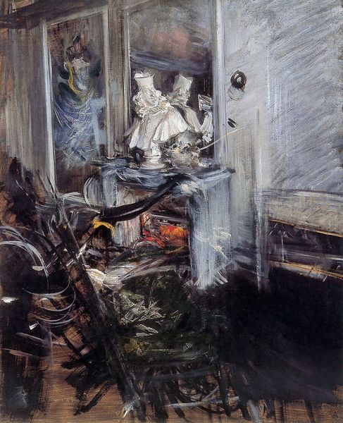 Curator: This is Domenico Induno’s "Sertine School," painted in 1865 using oil on canvas. Editor: It’s so dark! My first impression is the dramatic lighting… like a stage set. There is an intense spotlight on the woman in the foreground, drawing attention to her personal vanity in stark contrast to the dim environment and surrounding figures. Curator: Absolutely. Induno captures a scene of feminine craft and intimacy here, but also a reflection of emerging ideals. Consider the mirror and the emphasis on feminine presentation and adornment within a controlled setting. Editor: I’m really drawn to the visible brushwork here, the almost frantic strokes give a tangible quality to the silks and textures. It really makes you think about the artist laboriously constructing this very private scene for presumably public viewing. Curator: Yes! Observe also how the objects, such as the cards scattered across the room and the boxes, create a specific, symbolic composition. Consider what role fate, games, and fortunes may have played in the social imaginary of the era, and what connections Induno wants us to draw between games of chance and the everyday rituals performed by young women. Editor: The composition and brushstrokes definitely invite questions around material realities – what was being produced here? Was the production of this material a mode of domestic subjugation or economic liberation? Or something in between? How are these women's lives being built with fabric, with needles, and with thread? The subdued colors even reinforce this materiality as something used and slightly worn. Curator: Fascinating! Induno presents this workshop setting with an inherent sense of continuity with images of women working collaboratively throughout the centuries— and yet filtered through a contemporary obsession with display and appearance. The faces, although hard to discern, radiate a mix of pensiveness and focus. They have this enigmatic quality, characteristic of Romantic-era portraiture. Editor: To come full circle, the piece also acts as material in itself. Oil paint allowed for layers and details unavailable to many artists who came before, and so it allowed them to record, in a more "realistic" way, details from everyday life for a buying audience. The layers upon layers add up and up into a document. Curator: Beautifully stated. I hadn't quite framed it that way before. Editor: Thanks. Now that you point it out, I do see the artist's play with light and shadow hinting at complex states of mind at work there.