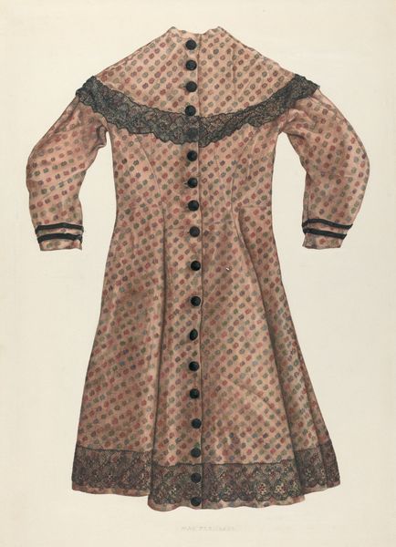 Raymond Manupelli made this watercolour painting of a child's dress at an unknown date. It presents an intriguing image when considered in its historical context. The dress itself, with its tartan pattern and ornamental details, evokes a sense of tradition and formality. In the time the artist was alive, clothing like this would have signified social status. However, it also marks a shift in childrenswear, moving from miniature adult versions to designs specifically for children. The meticulous rendering of the fabric and embellishments speaks to the changing market of textile manufacture, while also being sensitive to the artistic conventions of fashion plates. The image creates meaning through its visual codes and cultural references. Understanding the intersection of art, fashion, and social history requires archival research into textile production, retail practices, and even family portraits. The image embodies the complex interplay of social structures, and can also be a source of innovation and change.