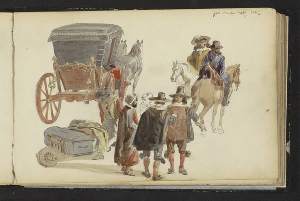 Curator: Here we have Louis Philibert Debucourt’s "Route de St. Cloud," created in 1816. It's a print, delicately rendered with watercolor. Editor: My first impression is one of barely controlled chaos, a frenzy of motion captured with surprisingly gentle washes of color. Curator: Indeed. Debucourt often used his art to subtly critique the societal norms of his time. This print provides a glimpse into post-Revolutionary France, perhaps commenting on the disparities within Parisian society. We see a coach hurrying down the road. The expressions on the faces within the carriage appear strained, disconnected. Editor: I agree. The almost caricatured depiction of the passengers draws attention to the distortions. And the horse itself—the exaggeration of its straining muscles, the flared nostrils—conveys an undeniable sense of urgency. Semiotically, it becomes a signifier for the anxieties bubbling just beneath the surface of Romanticism. Curator: Absolutely. Debucourt used watercolor not merely for aesthetics but to hint at the fragility of the era. The driver urging on the horse suggests a society rushing forward, perhaps without direction. This resonates with discussions surrounding social mobility and the evolving class structure of the time. There's a clear distinction between those being transported and the labor driving them. Editor: Note how the artist’s line is loose and gestural, a conscious decision that creates a sense of immediacy. The rapid strokes echo the subject’s headlong movement. The composition drives our eye from left to right—an implied narrative of acceleration, reinforced by the road cutting diagonally through the scene. Curator: Considering that this work, dating back to 1816, offers invaluable insights into post-Revolutionary France’s complicated landscape, it serves as a crucial point for interpreting the period. Editor: This study of contrasts—between the rough materiality and fluid medium, between order and frenzy—holds power beyond its historical significance. A beautiful paradox, and skillfully composed.