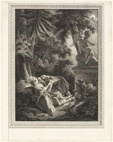 Curator: Well, what a whimsical scene we have here. Take a look at this engraving and etching, "The Mysterious Swing," artist unknown, housed here at the Art Institute. What are your first thoughts? Editor: It’s captivating—almost dreamlike with the dense baroque style foliage contrasting with the clarity of the figures. There's a definite spatial ambiguity, playing with the foreground and background that draws the eye deeper into the grove. Curator: Absolutely. The contrast highlights the material realities of production—the labour involved in etching, the paper source, and the economic forces at play in producing such imagery. It would have circulated among a privileged class, wouldn’t it? The theme of leisure depicted surely catered to those with ample free time and income. Editor: I agree about the socio-economic position of the target audience. But consider how the composition reinforces that narrative. See the sinuous lines throughout? The arrangement of the figures around the central action of the swing guides the eye to that playful, sensuous figure in the center, all under the shadowy canopy. It uses baroque elements to evoke an intimate, almost voyeuristic atmosphere. Curator: Precisely. This voyeuristic gaze raises questions about power dynamics of the period. Who is allowed to watch and who is being watched, particularly regarding the nude figures within the context of a pleasure scene? Editor: I’d also say the technical aspects of printmaking further contribute. The crosshatching to create shadow gives the whole image a vibrant depth that a simple drawing couldn’t achieve, underscoring both form and the latent drama of the composition. The texture invites tactility. Curator: You are absolutely right. Let's not also forget the cultural symbolism that could come with these lush outdoor spaces within art. How do the raw materials needed for such a piece also determine cultural ideas about production and pleasure? Editor: In short, the print successfully synthesizes form and subject into something much greater than the sum of their parts. A pleasure garden in monochromatic harmony! Curator: Agreed! Thinking of both technique and impact makes the artwork unforgettable.