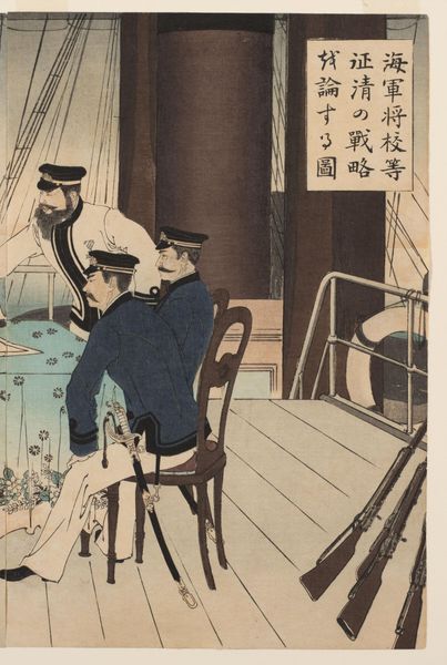 Editor: This compelling woodblock print, "Kaigun shoko to seishin no senryaku toron suru zu," by Mizuno Toshikata, depicts naval officers in discussion. The patterned tablecloth juxtaposed with the serious subject matter strikes me. How do you interpret this work? Curator: I see a commentary on the industrialization of warfare. Note the contrast: the delicate floral patterns, likely made by women, supporting maps of strategic planning, a male-dominated domain. The printmaking process itself—laborious and collaborative—mirrors the complex social forces at play in military expansion. Editor: That’s a really fascinating take, I hadn’t thought about the means of production. Curator: Consider also the consumption of these images. Who was the intended audience, and how did this imagery shape public perception of military endeavors? Editor: Food for thought. It definitely adds another dimension to the work!