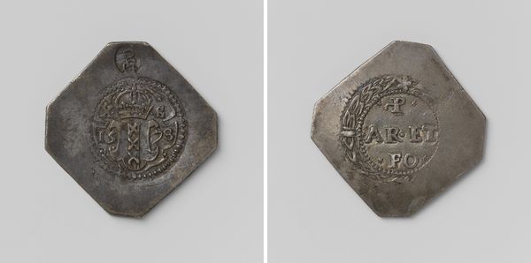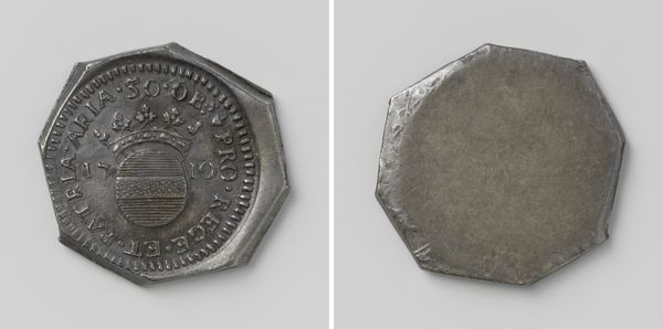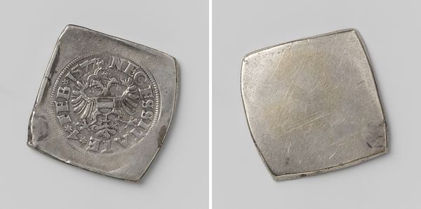 Curator: The "Twelve emergency coins from Dutch cities," believed to date from around 1577, really do seem to convey a story about crisis and resilience, wouldn't you agree? They're formed from silver. Editor: Immediately, what strikes me is how raw and unrefined they appear, more like hammered metal scraps than meticulously crafted currency. They exude a palpable sense of urgency. Curator: That visual texture is so vital to how we interpret them. The fact they were hastily produced using melted silver tells us much about the economic straits of the time, particularly the siege of Dutch cities during the Eighty Years’ War. Those city emblems were powerful political icons even if resources were scarce. Editor: And that heraldry, even crudely rendered, becomes a defiant assertion of identity, a means of maintaining economic and civic function in the face of disruption. These objects bridge social, political, and economic necessities through readily understood emblems of belonging. Curator: Exactly. Each coin is, essentially, a frozen moment of societal stress, where material worth takes on intense symbolic significance. Imagine those symbols as daily reminders that economic and civic order was at stake, their crude form speaking to more profound cultural disruption. Editor: It seems to illustrate that, in periods of intense struggle, symbolic value becomes far more critical. The silver becomes a carrier of meaning— less a measure of purchasing power, more an assertion of shared cultural experience and group identity. Even with these emergency issues being made fast and ugly! Curator: That visual language helped communities cohere, reminding individuals they weren’t just struggling alone, they were actively participating in the act of survival, which speaks volumes about resilience. Editor: So true. Examining this coinage underscores that, during times of great change or societal pressures, even simple objects can serve as potent reminders of shared heritage and enduring strength. Curator: Indeed. By considering them as cultural artifacts, we can reflect on the human capacity to create meaning from material scarcity and transform adversity into enduring identity. Editor: Precisely! It shifts our perception of money from being merely a transactional tool, towards understanding how deeply interwoven finance is within culture.