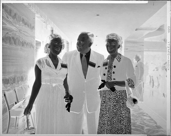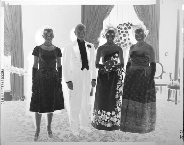 Curator: This is Peter James Studio's small, black and white photograph, "Untitled (beauty queen with potatoes and man and woman)," currently held at the Harvard Art Museums. What's your initial reaction? Editor: The stark inversion of light and shadow creates a theatrical tension. It's as if we're peering into some alternate, glamorous reality. Curator: The beauty queen, potatoes in hand, becomes an intriguing symbol of idealized femininity juxtaposed with humble, earthly sustenance. Editor: Yes, the contrast is striking. The composition—the hard lines of the stairs and the softer curves of the figures—adds to this sense of dissonance, doesn't it? Curator: Absolutely. The inverted image also gives a surreal quality, almost dreamlike. Perhaps it points to a deeper commentary on societal expectations of beauty and success. Editor: Interesting idea. I'm more focused on the photograph's tonal range, but I can see the tension you are describing. Curator: Food for thought, literally and figuratively. Editor: Indeed. A compelling study in contrasts, both visual and conceptual.