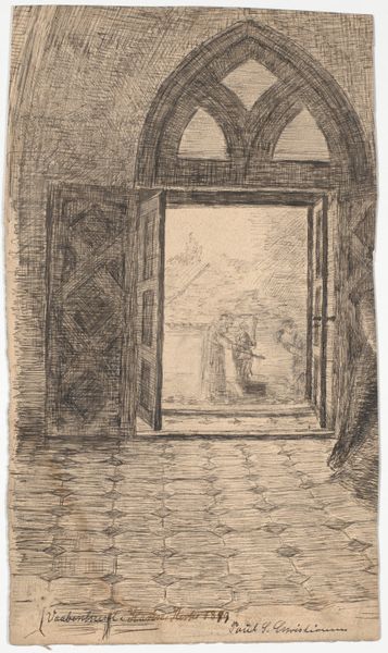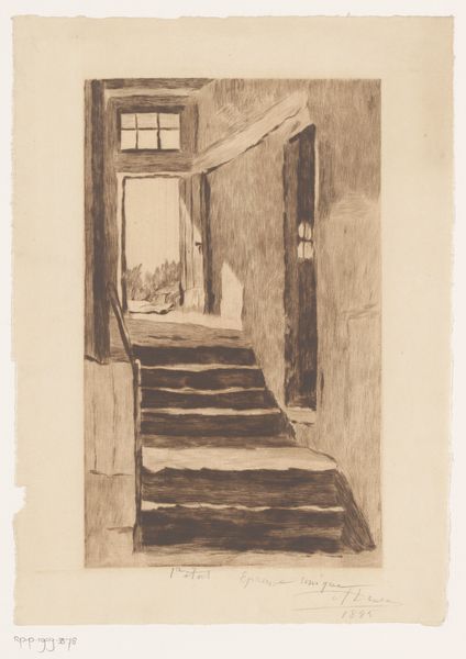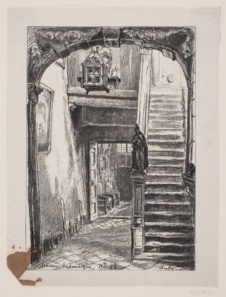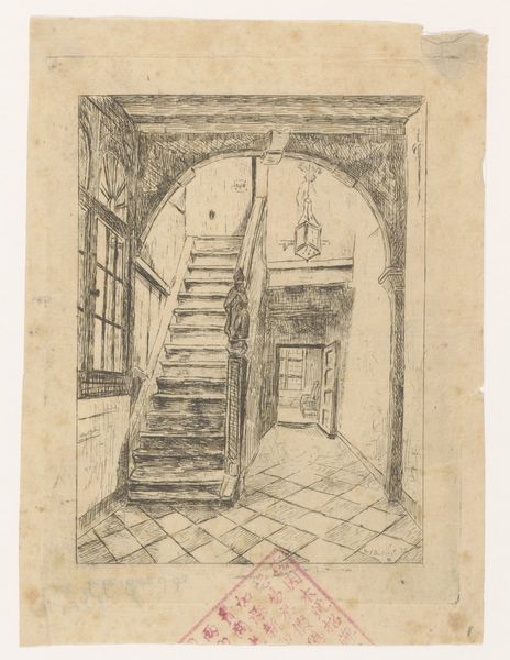 Editor: This is "Interior with a Staircase" by W.F. Barber, likely before 1910. It's an etching, mostly in pencil and ink, and I find its stark lines and tight composition incredibly captivating, almost claustrophobic. What symbolic weight do you think the image carries? Curator: An etching of an interior such as this one always suggests themes of access, ascent, and perhaps even hidden secrets. The staircase itself is a potent symbol across many cultures; a metaphor for social mobility, spiritual progression, or a journey into the unknown parts of oneself. The archway framing the stairs mimics a proscenium, inviting speculation: what drama unfolds there? Editor: I never thought of it as a stage! The placement of the stairs directly behind that arch is fascinating now that you point it out. Curator: The interior’s realism underscores that the climb can feel commonplace, even domestic, belying the profundity that the symbolic climb suggests. I am drawn to how Barber employs light here, creating dark spaces that draw the eye further into the building, inviting both physical and psychological exploration. What emotions does the use of line evoke for you? Editor: The lines contribute to the sense of confinement. The details on the staircase railing and the light fixture, coupled with the open door in the background... there's a contrast between ornamentation and emptiness that unsettles me. The perspective leads the eye away from the window – usually a source of hope. Curator: Exactly! And the tiled floor, a kind of checkerboard, suggests a game afoot. The interior might point to themes of constraint versus freedom. Are we players in the depicted scene, or merely observers? Editor: That’s quite thought-provoking. It’s interesting how an everyday scene can become so psychologically loaded when viewed through the lens of symbols and hidden meanings. I'll never look at a staircase the same way again. Curator: Precisely. Barber seems to have understood the latent power of familiar forms, giving us an interior that prompts self-reflection about choices and pathways.