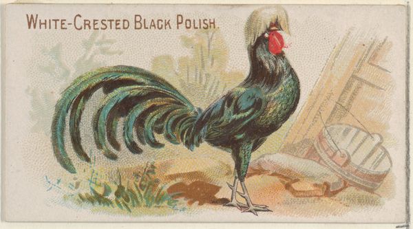Curator: Check out this gem from 1891—it's called "Black Hamburgh," and it comes from the Prize and Game Chickens series, put out by Allen & Ginter for their cigarettes. Can you believe this used to come in a pack of smokes? Editor: Wow, it feels so formal for a cigarette insert. The detail is astonishing for something so small—look at the feathers catching the light. I'm instantly reminded of paintings depicting landed gentry on their estates, but, you know, replace the lord with a very handsome rooster. There's a powerful patriarchal analogy lurking there, I think! Curator: Ha! Absolutely, and that’s kind of the brilliance, right? This isn’t just about selling smokes. Allen & Ginter tapped into this whole late Victorian fascination with pedigree and showmanship, equating their brand with quality. The coloured-pencil technique adds this veneer of refinement to a humble bird. Editor: And framing him with what appears to be some sort of archway also elevates his presence and status. Although it is printed, it really gives you this feeling of a meticulously drawn portrait in the academic art style. The gaze is really commanding—a lot of these types of fowl, and I say this in the most respectful way possible, do not evoke such admiration. Curator: The choice of the Hamburg, too, is interesting. They were known for their striking plumage and lively personality, supposedly. It is really a nice drawing. Someone took a lot of time with the feather detailing—you almost want to reach out and touch the bird, like you would feel their smoothness. A little unusual, given what the image's intended commercial purpose was. Editor: Perhaps this hints at a burgeoning turn-of-the-century commodification of nature. Placing it on a pedestal of perfection as a means to inspire consumer desire. Were we really even ready to grapple with such profound questions embedded within our casual habits back then? How do you make cigarettes glamorous, though? This chicken is part of that puzzle, bizarrely enough. Curator: Totally bizarre, and that’s what makes it compelling. These little trade cards offer tiny glimpses into the values and aspirations of that time. Like you were mentioning, who knew a rooster could carry so much… baggage? Editor: In the end, this glorified chicken reminds me to always be curious and questioning. An item you could just find included with cigarettes serves to showcase how even our everyday purchases, as silly as the commodification is, embed larger societal beliefs and cultural standards.