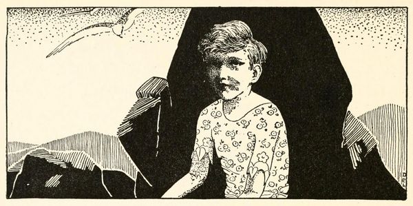 Editor: We're looking at "A Little Boy Lost," a 1920 pen illustration by Dorothy Lathrop. It's a stark, almost unsettling image, with a heavy use of linework. What draws your eye when you look at this piece? Curator: Oh, this whispers to me of those peculiar childhood reveries, doesn't it? Look at the boy, swallowed by the shadows, the strangely angular, almost hostile tree offering no comfort. I wonder if Lathrop aimed for that sense of isolation; she might've been tapping into a collective fear, or perhaps a solitary dread she knew intimately. Do you feel it, too, that lonely echo? Editor: I do. The tree feels…protective, but also menacing. It's interesting that you mention her own feelings. Does the art historical context offer some clues here? Curator: Indeed! Consider the era—just after the first World War. The world was reeling, disillusioned. Lathrop, known mostly for children's book illustrations, might be subtly portraying that lost innocence. And think about the power of fairytales -- often the safest way to voice complex societal woes. Perhaps that little boy represents a generation adrift, clinging to spiky hopes. Or the very idea that he must navigate through an imposing, thorned obstacle. Editor: It is like he’s sheltering from a world too difficult to bear. This is a very different Lathrop from the one I had in mind! So she could well be hinting at something a little more complex? Curator: Exactly! See how she masterfully balances delicacy with something bordering on starkness? Lathrop leads us down a garden path, with hidden teeth. Does it make you see the drawing with slightly different eyes? Editor: Definitely. I went from initial apprehension to seeing something more symbolic and historically resonant. Thank you! Curator: My pleasure! It's like peeling back an onion, isn't it? Layers upon layers. What a thought!