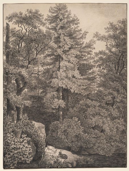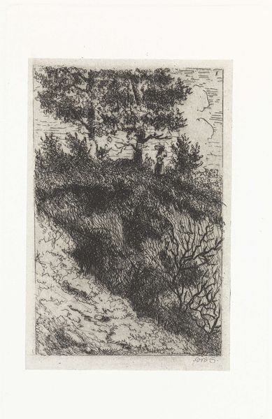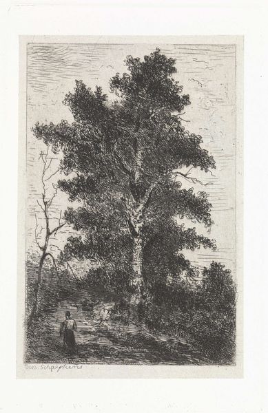 Curator: Before us is "Landweg met wandelaars," or "Country Road with Walkers," an etching by Arnoud Schaepkens, created sometime between 1831 and 1888. Editor: Immediately striking. There’s a dense, almost claustrophobic feel despite it being a landscape. The light is quite subdued, creating a rather somber mood. Curator: Schaepkens was clearly interested in the effects achieved through etching; you can observe the labor-intensive, repetitive process used to create depth and shadow, built line by line, demanding both skill and physical endurance from the artist. We must consider what printmaking meant socially. Cheap dissemination, circulation amongst working folk… Editor: I'm captivated by the stark contrasts. Notice how he uses varied densities of lines, strategically placed, to differentiate the textures, such as foliage against the sky. Also the rhythmic, almost calligraphic quality of his linework; it imparts a visual energy. Curator: Considering it's a reproductive medium, it makes you think about the purpose of the print in Dutch society during this period. Was it for broader circulation, accessibility? Or was it still intended for the bourgeois classes? And what were the socio-economic conditions that influenced its making? The availability of materials, the marketplace... Editor: Setting aside those socio-economic implications for a moment, the formal composition alone draws my eye: the contrast of dense foreground with that paler, softly rendered sky... How the path leads into a somewhat obscured middle-ground—inviting a kind of visual, perhaps emotional, entry. Curator: Absolutely, the path and its human figures serve not only an aesthetic purpose, guiding the eye, but also as potent symbols of labor. It forces us to remember these anonymous individuals’ daily lives and the means through which landscape as property was defined, circulated, and experienced by its inhabitants. Editor: I appreciate your emphasis on the labor connected with its material reality. Yet, ultimately, the visual experience and internal formal relationships speak of something larger— a deep sensitivity to landscape's expressive power. Curator: Yes, we might never agree about the essence of an artwork; to think more deeply about that artist and the viewers he made that etching for provides a more complete insight. Editor: An intriguing work! It has rewarded careful study.