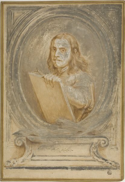 Curator: What strikes you about this piece? It's a wood relief carving of Prince William III of Orange, dating from around 1662 to 1665. Editor: Its muted tones create a powerful impression, one of delicate, yet determined regality, embedded as it is within an intricate wooden surround. Curator: Yes, there's a formality embedded within the Baroque framework. Note how the sculptor uses layering, from the carved wooden frame to the figure of William himself. It directs the gaze inexorably inward, framing William as the centre of the artwork and by extension, perhaps, the nation. Editor: Absolutely, and considering the time period, there’s an implicit commentary on power and representation here. William, as Prince of Orange, carries the weight of societal expectation and the looming battles in the Anglo-Dutch wars—evident not just in his portraiture, but in the symbolism imbued by the attire and the sceptre. How interesting to reflect on how identities were shaped by the intersection of power, heritage, and conflict during this time. Curator: The tight composition is masterfully achieved with linear elements. We have, within a fairly restricted area, incredible detail—observe the contours of the prince's face against the high ruff collar. Editor: It makes me wonder, though, about the choices made in representation. He's young, almost boyish, yet carries symbols of governance. The craftsmanship elevates him, certainly, but does it fully mask the political turmoil? Is he rendered here as merely an emblem? Curator: Perhaps, but it’s in the rendering of emblems that such figures take on enduring significance beyond any singular time. By alluding to permanence and idealization, an allegorical presence begins to emerge, allowing viewers across centuries to experience their effect. Editor: I see what you mean, though my eye keeps getting drawn to the contextual complexities that informed not just its subject but its potential intended audience and placement. The craftsmanship certainly indicates that the elite enjoyed the comfort afforded by luxury items in an unstable period. Curator: A fitting thought, and one which allows this relatively small carving to occupy a rather large space in understanding how both personal and political realities take form across time. Editor: Indeed; I walk away seeing so much more now beyond what's superficially depicted within this small tableau of power.