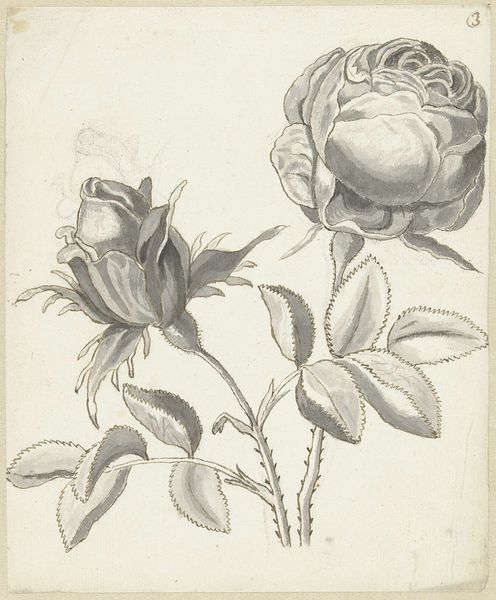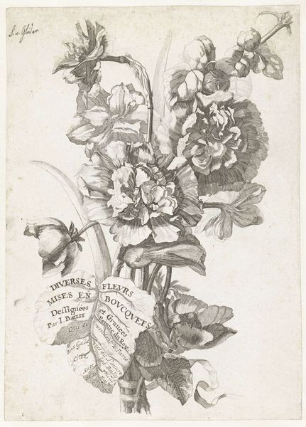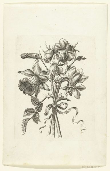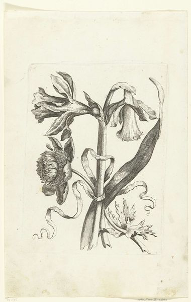 This small print, "Drie bloemen, rechts een tulp," held at the Rijksmuseum, was made using the intaglio process, where an unknown artist etched lines into a metal plate, likely copper. Ink would have been applied, then wiped from the surface, remaining only in the incised lines, before being printed onto paper. The stark contrast of lines creates texture that mimics the delicate surfaces of petals and leaves. Notice how the varying line weights give depth and volume to the tulip bud and daffodils. The artist’s skill is evident in the precise rendering of botanical details and the subtle gradations achieved through cross-hatching. Consider the labor-intensive nature of this process, where each line represents meticulous work. The print medium allowed for wider distribution of images, fueling a burgeoning market for botanical studies and decorative arts. By understanding its making, we see how this print bridges the gap between scientific illustration, artistry, and the economics of printmaking.