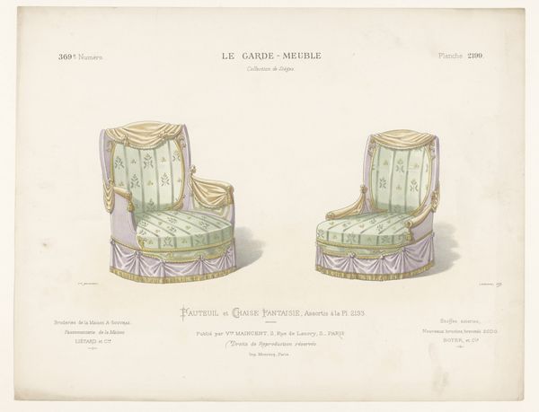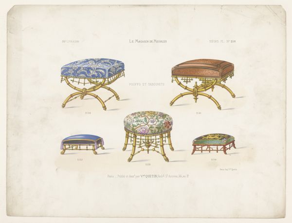 Here we see "Drie poefen", a lithograph presenting three cushion designs by Léon Laroche. Immediately striking is the organized layout, where each pouf, rendered in soft pastels, assumes a distinct geometric form, inviting a comparative analysis of shape and texture. Laroche’s approach to design becomes evident through his manipulation of form. The poufs, though similar, display unique characteristics in shape and color. Note the contrast between the angular lines of the square poufs versus the soft curve of the round one, each employing a different type of ornamentation to underscore its shape. These choices create a visual rhythm that oscillates between rigidity and fluidity. The lithographic technique itself deserves attention. The medium allows for a detailed yet delicate rendering of the tassels and fabrics, heightening our tactile perception. We are compelled to examine how such visual elements not only serve an aesthetic function but also engage us in a dialogue about materiality and representation.