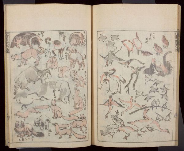 Editor: Here we have volume one of Hokusai's Manga sketchbooks. It's an open book, filled with images of sea creatures. The composition feels dense and encyclopedic. What do you make of it? Curator: Hokusai's Manga wasn't manga as we know it today, but rather a collection of sketches intended for other artists, artisans and the general public. Consider its historical moment: Japan was opening up after a long period of isolation. How might this compilation of freely-shared images have been perceived? Editor: It would have been seen as a way to disseminate knowledge and imagery more widely, like a visual resource available to everyone. Curator: Exactly! Hokusai democratized art making, impacting not only Japanese art but also influencing Western art movements through Japonisme. Editor: That’s fascinating – it’s more than just a sketchbook, it’s a cultural artifact! Curator: Indeed. This sketchbook reveals the social function of art.