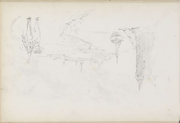 Editor: This landscape, circa 1891, is simply titled "Landschap," which translates to "Landscape," and it's a drawing by Egbert Rubertus Derk Schaap, rendered in pencil on paper. My first impression is one of delicacy. It feels almost ephemeral. Curator: Precisely. Observe the artist’s economical use of line. Note how Schaap eschews tonal shading for contour, thereby generating form through sheer articulation of edge. Editor: Yes, the linework. It creates a sense of barely-there forms. The suggestion of trees, of some kind of water… what does this type of landscape mean to you, symbolically? Curator: The image prompts questions regarding the very definition of landscape. Its sketched quality destabilizes concrete identification, rendering the scene open to semiotic interpretation rather than merely mimetic representation. We are left only with faint traces. Editor: Faint traces of nature, indeed, but within Dutch art, landscape painting carried connotations of national identity and even spiritual meaning. Do you see echoes of that here, however understated? Curator: Perhaps the suggestion of nature as an ungraspable ideal, available only through fragmented impressions? The use of negative space certainly emphasizes a certain hollowness or longing. Observe how the pencil strokes vary in pressure, creating subtle rhythms. Editor: There’s also a raw, unfiltered quality here, a kind of immediacy that allows you to glimpse the artist's working process. It's like peeking into his sketchbook. Curator: An intimate encounter facilitated by Schaap’s restrained vocabulary. He prioritized formal reduction over descriptive accuracy. Editor: This approach really allows for the viewer to project their own narrative onto the work, making it incredibly personal. Curator: Exactly. The structural composition guides, but doesn’t confine. It allows our gaze to find our own story within it. Editor: It leaves us in a shared space of suggestion, then, wouldn't you say? Curator: An accord of forms rather than a fixed landscape, perhaps a transient, suggestive visual pact.