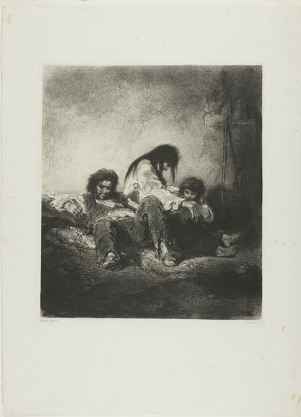 Curator: Oh, this piece… it vibrates with a profound grief, doesn't it? The way the scene unfolds in somber tones... almost monochromatic, like a faded memory etched in time. Editor: Indeed. What we're looking at is "Allegorie op oorlog" ("Allegory of War") created in 1873 by Jean-François Portaels. This work at the Rijksmuseum uses light pencil work to present a powerful statement on the devastating impact of war. It feels incredibly poignant. Curator: It’s a simple technique, pencil on paper… but the impact is anything but. Look at the woman's face! It tells the entire story. That stark expression, cradling the children... like life itself is slipping away from her. There is raw emotion in the apparent abandonment within this seemingly handprinted image. Editor: The scene embodies a disruption of traditional maternal depictions. Instead of idealized love, we see a kind of terror and desperation etched onto the allegorical figure, reflecting the grim reality of war's displacement and loss for women and children. Her exposed body is a raw signal of precarity within war and represents those that exist within these intersectional narratives. Curator: There is an ache in this art. I notice it mostly in her downcast eyes... I see what appears to be light, maybe hope, but I sense there is so much more depth. Is it resignation? Defiance? Or a yearning for a world beyond her grasp? She could be anybody. Editor: Right, she acts as a mirror to broader social and political tragedies. Note the discarded weapon lying beneath her, a stark reminder of conflict. Her pose also recalls traditional "pietà" images, drawing a connection between personal suffering and historical representations of grief in order to explore trauma and societal upheaval. Curator: The yellowing of the aged paper almost adds another layer, another passing. Editor: Exactly, the damage serves as an allegory to the decay of life and hope during wartime, reinforcing the critique of militarization and power structures. These artistic elements emphasize that peace and stability is needed. Curator: Standing here, thinking of Portaels’ world while creating this image... I see this woman transcending the paper. Editor: Through its simplicity, "Allegorie op oorlog" speaks profoundly about humanity’s recurring struggles. It serves as an invitation to reflect on these challenges, consider their complexity, and take responsibility within it all.