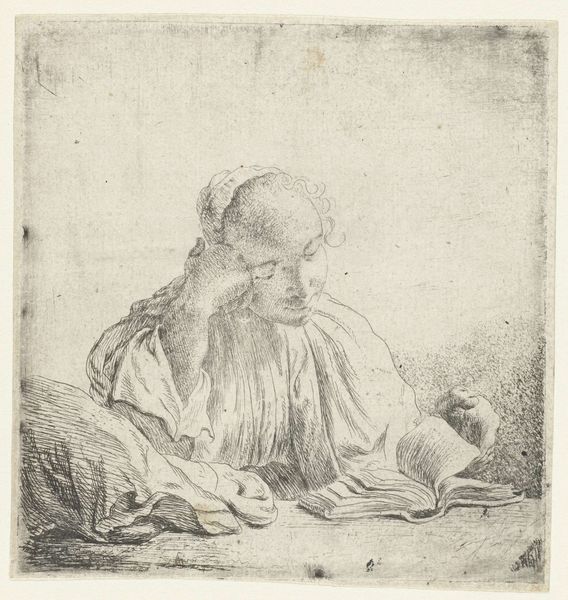 Editor: So here we have "A Milkmaid," a drawing made between 1642 and 1646 by Aelbert Cuyp. It looks like it was made with pencil on paper. What immediately strikes me is the pose – it feels very deliberate, yet the rest of the scene is barely sketched. How do you interpret this work? Curator: Indeed. Formally, the emphasis resides within the interplay between the solid figure and the tentative lines suggesting an atmospheric perspective. Observe how Cuyp utilizes variations in the density and directionality of his pencil strokes to articulate the form of the milkmaid. The strategic deployment of light and shadow models her figure, grounding it within the composition. Editor: It's almost as if the milkmaid exists in one space, while the landscape exists in another, solely as thin lines, with seemingly no relation to her. What do you make of that deliberate contrast? Curator: Consider the work's structural balance: The weighty presence of the figure is visually stabilized by the lighter, airy landscape behind. It might also reveal something of Cuyp's artistic priorities—a focus on rendering human form and presence, and a formal meditation of the woman's inner psyche, rather than the details of the environment around her. The setting becomes secondary, merely suggestive. Editor: I see what you mean. Looking at it again, her form is incredibly detailed and dense with shading while the thin lines in the backdrop suggest a sort of 'echoing' of her energy... Curator: Precisely. These compositional decisions invite contemplation on the relative importance of subject and setting, and also on Cuyp’s understanding of the potential of pure form. What might at first appear as imbalance is actually an intricate strategy to pull our attention and, ultimately, suggest deeper questions. Editor: That’s a perspective shift for me. I went in thinking something was missing from the piece, and now I see the sketch-like background is itself a deliberate statement about drawing. Curator: A fascinating realization, isn’t it?