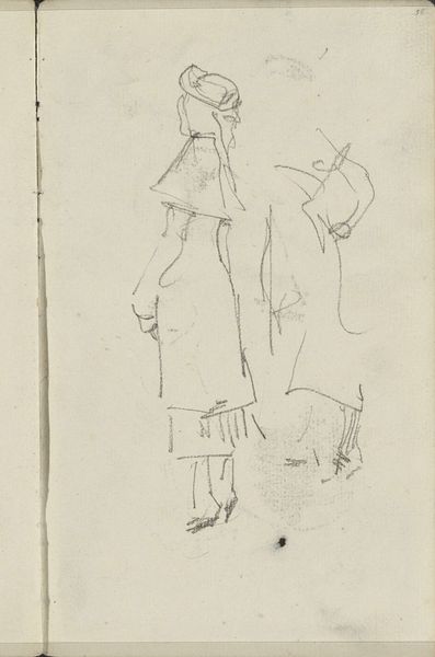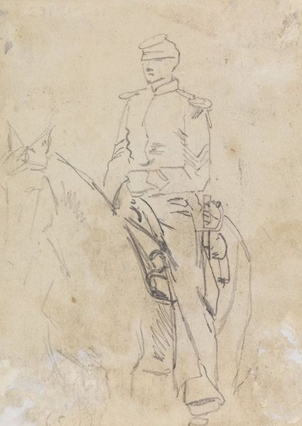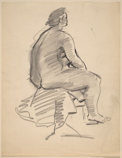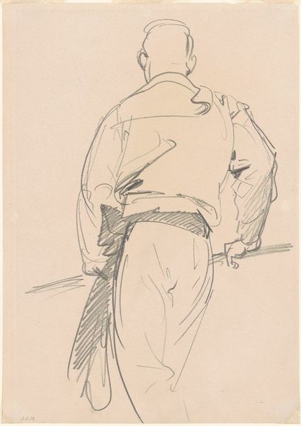 Curator: Here we have Mark Rothko’s drawing, "Rear View of Kneeling Figure with Head Turned Left." It is rendered in pencil. Editor: You know, the first thing that strikes me is a profound sense of isolation. This figure, rendered with such sparse lines, seems entirely lost in thought. Curator: The composition indeed directs our focus to the internal state. Notice the economy of line. Rothko captures the essence of the figure with minimal strokes. The use of hatching suggests volume. The light seems to emanate from the paper itself, highlighting the subject's posture of introspection. Editor: Introspection, absolutely. It feels like a glimpse into someone’s most private moment, like they're wrestling with something significant. There’s a certain vulnerability in turning away, isn’t there? Almost like they don’t want to be seen in this state. The sketchy, unfinished quality also adds to this sense of capturing a fleeting, unguarded moment. Curator: Precisely. The incompleteness is part of its power. It invites us, the viewers, to fill in the emotional gaps. We are left to contemplate the reasons for this person's posture, and their downcast gaze turned slightly toward us creates a haunting effect. Consider the deliberate absence of detail, compelling us to engage with form. Editor: Yes, form over content perhaps. It’s like Rothko gives us just enough to spark an emotion, a connection, but leaves the specifics delightfully ambiguous. I’m reminded of the figures in his later color field paintings, those looming rectangles, each one a doorway into a feeling without a name. Curator: It serves as a reminder of the inherent subjectivity in viewing art. Our own experiences, our own internal states, will inevitably color how we interpret this image. The strength of the drawing lies in its ability to be a vessel for our own emotional projections. Editor: It really makes you wonder what's going on in that turned head. It's more a question than a statement, I think. What do you think this drawing tells us about Rothko? Curator: I am convinced that this small pencil drawing reveals his fascination for form and light, as much as any later works. Editor: Absolutely, a beautiful whisper of emotion captured in pencil.