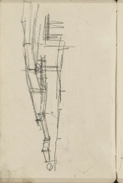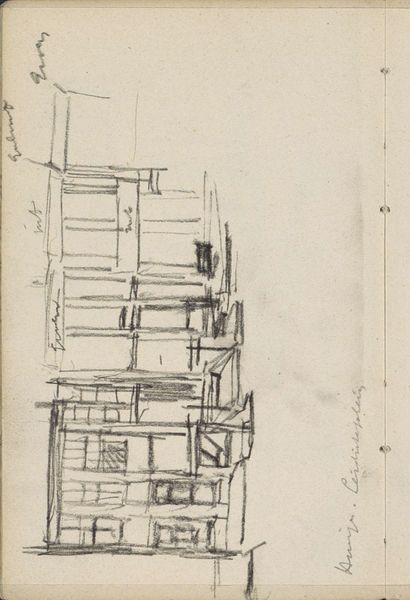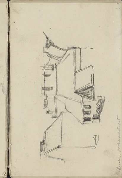 Curator: George Hendrik Breitner’s drawing, dating back to around 1902, is titled "Gezicht in Amsterdam, mogelijk het Damrak" – or "View in Amsterdam, possibly the Damrak." Editor: It's… stark. Like a memory half-formed, a ghost of a cityscape in pencil. There's a raw energy, even in its unfinished quality. Curator: Absolutely. Breitner's approach here is more about capturing a fleeting impression than creating a polished, detailed image. The hasty lines, the visible process... it feels modern, doesn't it? Editor: It does. I'm immediately drawn to the linear elements – the vertical thrust of the buildings, those almost aggressively rendered window ledges. The way he plays with light and shadow is also remarkable for just a pencil drawing; he coaxes volume from what looks like very little. Curator: Exactly! And although the subject is a classic Amsterdam cityscape, Breitner's use of perspective and line defies conventional landscape art of the period. It aligns more with the modern sensibilities emerging at the turn of the century, wouldn’t you say? Editor: Indubitably. Consider the semiotic density encoded in its very "unfinishedness". The absence of meticulous detail, usually a mainstay of realist cityscapes, becomes a statement. The work almost dares the viewer to complete the scene – to engage actively in the viewing process. Curator: That makes sense. I feel as though I am not just viewing, but experiencing Amsterdam as Breitner must have experienced it: briefly, passionately, and without pretense. A snippet from a busy moment, that makes my head spin, like a photograph of an emotion. Editor: And look at that lone figure at the base! Almost swallowed by the architectural immensity surrounding it. Curator: Yes. The whole artwork feels fragile, but its apparent simplicity conceals profound thoughts about change and urban existence. Editor: A deceptively simple sketch revealing complex artistic statements about our urban world. Curator: A powerful glimpse into the evolving soul of a city.