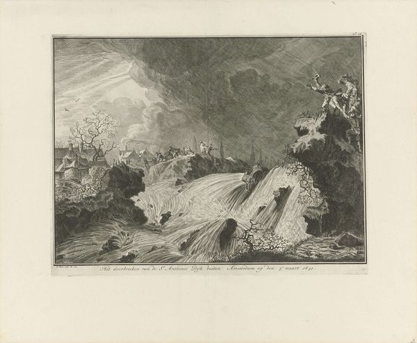 Curator: Look at this etching, "Jacob's Ladder" by Rembrandt van Rijn, made sometime between 1616 and 1719. The interplay of light and shadow immediately draws me in. Editor: It evokes such a strong sense of isolation and divine intervention all at once. This solitary figure amidst a landscape literally touched by the heavens - how does Rembrandt leverage the symbolism of verticality here, contrasting the reclining Jacob with the towering vision? Curator: He does it through dramatic contrast. Notice the ground's textured etching and compare it with those luminous, unearthly rays of light descending from the sky. That sharp distinction pulls the eye upwards, enacting a spiritual ascent on the viewer. The strong verticals are enhanced by his skillful application of crosshatching that provides tonal and formal strength. Editor: Absolutely. The way that light floods from the top corner - what does that mean for us? The angels aren’t equally distributed or explicitly shown, so does their concealment reveal the potential for salvation and danger to be deeply embedded into systems of faith and patriarchal expectations? This could reference personal journeys, with Jacob as representative. Curator: The landscape surrounding Jacob certainly grounds him, both visually and narratively, yet this technique elevates the divine aspect, visually disrupting his earthly domain with otherworldly light and forms. It accentuates this sense of Jacob straddling two worlds - the real and the transcendental. The crosshatching technique, a hallmark of baroque art, adds depth. Editor: Given Rembrandt's own lived experience, are we able to expand beyond pure aesthetic appreciation? For me, it’s tempting to situate this in the lineage of depictions of vulnerable bodies encountering manifestations of the divine. Curator: Ultimately, it invites contemplation on the nature of dreams, faith, and the complex relationship between humanity and divinity. A compelling exploration of spiritual awakening through purely visual means. Editor: A testament to the capacity for rendering theological ideas into tangible material culture; it serves as both document and portal, inviting those to not simply witness but perhaps also partake in transformative dreaming practices.