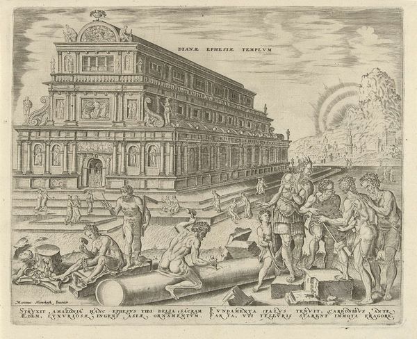 This engraving, "From age 32 to 48: the Ionic Order," was created around the late 16th century by Wierix. Notice how the architectural rendering divides the composition into sharply contrasting spaces, from domestic scenes of family, to the violence unfolding in the background. The Ionic order depicted in the building is set against the disorder of conflict. This contrast destabilizes our reading; what values are being presented? The graphic qualities of the engraving, with its precise lines and textures, create a structured visual field. However, this structure contains a multitude of elements that resist easy categorization. The architecture and Ionic references serve as cultural codes inviting viewers to contemplate the social and political realities of the period. Consider how Wierix uses form to open up spaces of questioning, prompting us to look beyond the surface to the tensions between order and chaos, peace and violence, inherent in human experience.