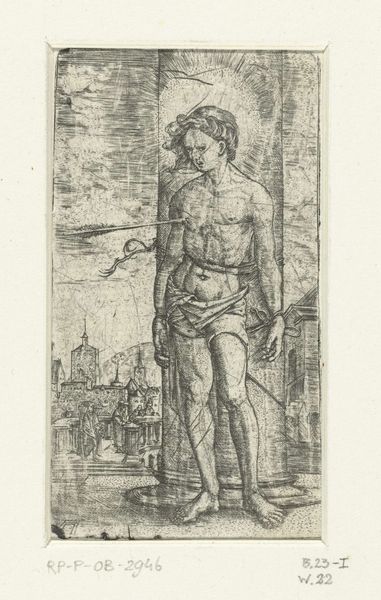 Heinrich Aldegrever created this engraving, Reverse Copy of the Top of Dagger Sheath with David Holding the Head of Goliath, during the 16th century. At first glance, the intricate linework and the compact composition draw you in, compelling you to examine the detailed musculature of David and the gruesome head of Goliath. Aldegrever's mastery lies in his ability to convey depth and texture within such a small format through cross-hatching. The stark contrast between light and shadow accentuates the dramatic tension of the scene, emphasizing the victory and violence inherent in the biblical story. The choice of engraving as a medium is crucial here. Its precision mirrors the precision of David's act, creating a sense of clarity and purpose. It challenges the traditional Renaissance heroic nude by infusing it with a Northern European sensibility. The engraving becomes a complex interplay of form and content, inviting us to consider how artistic techniques can amplify the meaning and impact of a well-known narrative.