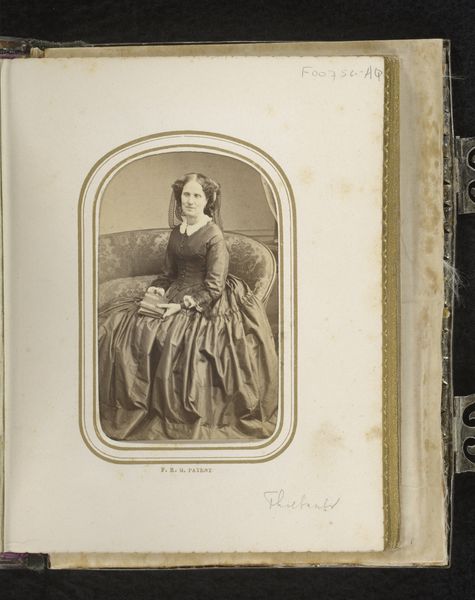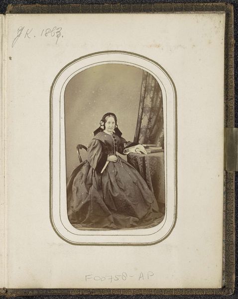 Editor: This is an albumen print dating from around 1855 to 1880, entitled "Portret van een staande vrouw," attributed to Achille Ernest Mouret. The woman's expression seems rather serene, almost melancholic. What underlying stories or meanings do you think are woven into this image? Curator: It’s fascinating how a seemingly straightforward portrait can act as a cultural vessel, isn't it? Consider the elaborate gown. The heavy fabric and formal cut suggest status, but also restriction. Is it a celebration of prosperity, or a visual encoding of societal expectations? Also, the staged backdrop - a hint of nature controlled by architecture. What does it tell us about the era's relationship with the natural world, about the desire to tame and frame it? Editor: I hadn’t considered the backdrop in that way. It’s almost like she’s been placed in a theater set, not really in nature at all. Curator: Precisely! The composition steers us towards a certain performance of self. The chair behind her isn’t for sitting, but rather functions as another prop – another signifier of status. The visual language here creates a dialogue about identity, performance, and societal position. Do you think her 'serene' expression could be masking something else, a quiet resistance maybe? Editor: It definitely complicates my initial reading. I was so focused on her dress that I overlooked everything else as just… background. Curator: It's all interwoven, the visual vocabulary forming a compelling narrative. We look at this image now, across time, and decode it, layering our understanding on top of what was initially intended. It’s cultural memory unfolding before our eyes. Editor: This makes me appreciate the layers within seemingly simple portraits. It’s more than just capturing a likeness. Curator: Absolutely, the resonance lies in understanding those encoded signs.