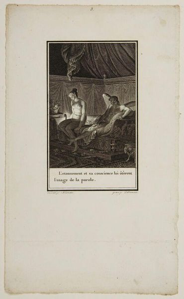 Curator: This etching by Remi Henri Joseph Delvaux presents a scene titled "She drew a great sigh from the heart . . .". The work can be found at the Harvard Art Museums. Editor: It's strikingly dramatic! The stark black and white really highlights the vulnerability of the figures against that imposing landscape. Curator: Delvaux’s use of etching allowed for fine detail, crucial in conveying the emotion and narrative elements typical of the period's romanticism. The work itself is speaking to a very particular social aesthetic. Editor: And the labor involved! Imagine the time spent meticulously etching those lines into the plate. It speaks to a culture of careful craftsmanship and attention to the material itself. Curator: Absolutely. The print would have been widely disseminated, bringing these classical themes to a broader audience. Editor: It's fascinating to consider the cultural implications of making this level of artistry accessible through printmaking. Curator: Indeed. A remarkable testament to both technical skill and its era's concerns. Editor: Yes, a small piece, but quite powerful in its execution.