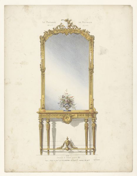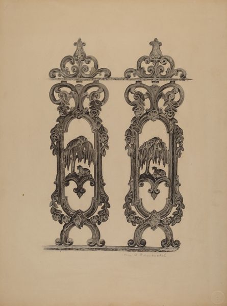 Editor: This is a drawing entitled "Carved Walnut Hall Rack," created around 1936 by Thomas Byrne. The rendering in ink feels both intricate and a little… melancholy to me. What’s your take on this piece? Curator: The stark contrast in Byrne’s drawing makes me consider how even mundane domestic objects carry embedded social narratives. A hall rack, traditionally placed near an entryway, served as a transitional object between the private sphere and the public world. Editor: That’s an interesting way to put it. A liminal space. Curator: Exactly! Now, think about 1936. What anxieties might people have carried with them as they entered or left their homes? What roles—gendered or otherwise—did that hall rack subtly enforce, by holding hats, coats, umbrellas? Does this connect to domestic labor or gender roles for you? Editor: I hadn't considered that at all. The rack is so ornate; I was just thinking about craft, but seeing it as a symbol of societal pressures... Curator: And look at how Byrne renders the mirror--as a series of vertical bars that obscure, not reflect. Is Byrne making a comment on how society obscures identity, creating a fractured reflection of the self? What are the implications of having such a divided identity? How can society reform to accept a holistic sense of self for those who are made to feel ‘other’? Editor: Wow, I see it completely differently now! Thank you for broadening my perspective. Curator: It’s all there in the piece, just waiting to be excavated! I think reflecting on pieces such as this helps contextualize not only society in the 30s, but current day constraints and social struggles that continue to permeate the American Dream.
