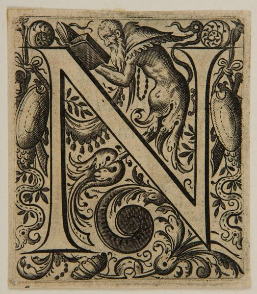 Curator: Here we have "Letter Q," an anonymous work residing here at the Harvard Art Museums. My initial impression is one of potent symbolism contained within a small, densely ornamented space. Editor: The centaur almost bursts from its frame, doesn't it? It’s hard to ignore the visual tension in the composition; the artist seems to be playing with confinement and release. The figure’s arm bisects the Q, drawing attention to the boundaries. Curator: I agree. The centaur—a mythological figure often associated with both wisdom and primal instincts—takes on a particular charge within this illuminated letter. Consider the historical role of illuminated letters at the forefront of important texts— Editor: And how this imagery would have shaped the understanding of the following text. I’d add that the very materiality of this print—likely a woodcut—democratized knowledge, bringing art to a wider audience beyond the elite. Curator: It's fascinating how the stark lines create such depth and movement. It really encapsulates a complex duality, doesn't it? Editor: Indeed. And perhaps by contemplating this dynamic, we begin to question the inherent symbolic structures embedded in art and society.